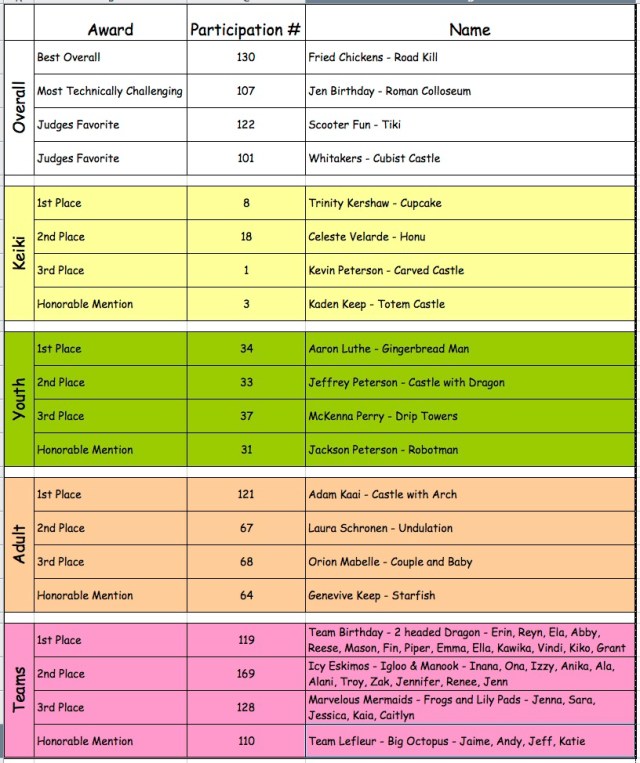 FREE for all ages one day sand castle/sculpting contest and music festival each year on Kauai. It is totally non-profit. Under the auspices of INCFworld.org which is a 501(c)(3) and able to take donations and prizes. All prizes awarded by judges to the best sculptures by all ages.